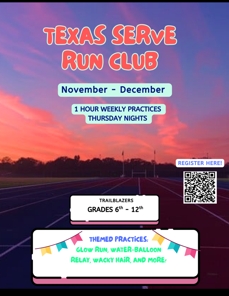 The Texas Serve Run Club is all about making running fun! Each practice is designed to keep kids moving, laughing, and learning through games, relays, and themed practices. While the focus is on having a great time, we also emphasize important running mechanics-such as proper form, pacing, and endurance. It’s the perfect mix of fitness, fun, and friendship!